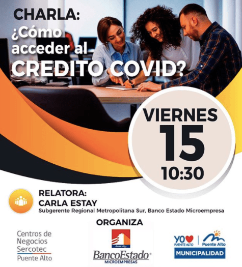 Atención Emprendedores y Pymes!! Están todos invitados a participar de la charla ¿Cómo acceder al Crédito Covid? Iniciativa organizada de manera conjunta entre Centro de Negocios Sercotec Puente Alto, Municipalidad de Puente Alto y Banco Estado Microempresa.